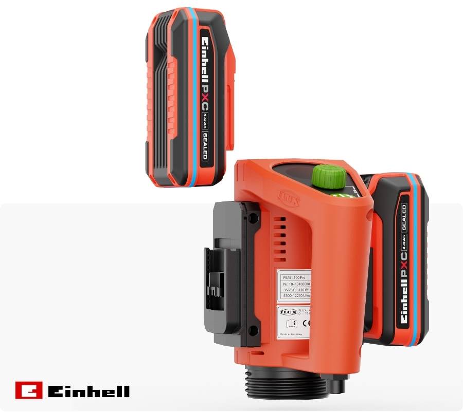 Der FBM 4100 Akku-Motor ist kompatibel mit allen 18-V-Akkus der Einhell Power-X-Change-Serie. Die Schutzabdeckungen können Akkus mit einer Kapazität von bis zu 4 Ah aufnehmen, wodurch für das Gesamtgerät die Schutzklasse IP24 erreicht wird. Bei Entfernen der Schutzabdeckungen und Verzicht auf die Schutzklasse IP24 können Akkus mit größerer Kapazität verwendet werden. Derzeit sind bis zu 8 Ah möglich, wodurch noch längere Motorlaufzeiten erreicht werden.