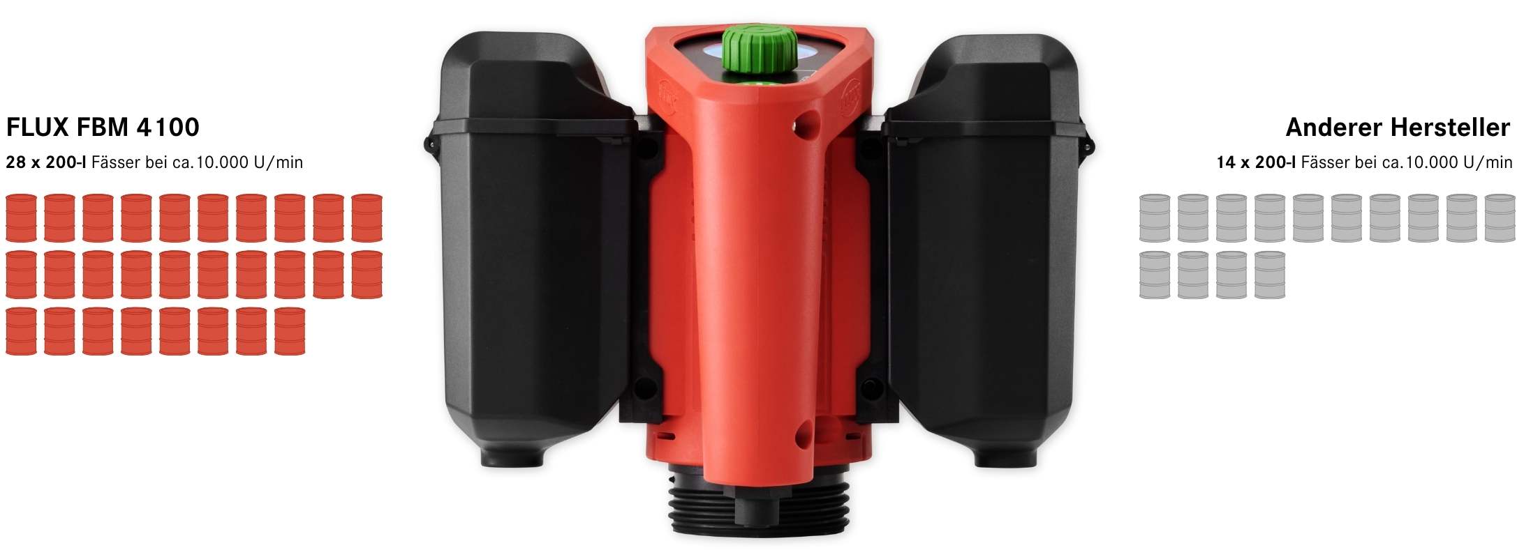 Im Set mit einer F 430 Fasspumpe mit 2 m Schlauch und Zapfpistole erreicht der FBM 4100 eine Fördermenge von bis zu 45 l/min bei 8.500 U/min. Das Pumpenset entleert ein 200-Liter-Fass in ca. 4,5 Minuten und einen 1.000-Liter-IBC in rund 22 Minuten (gemessen mit Wasser).