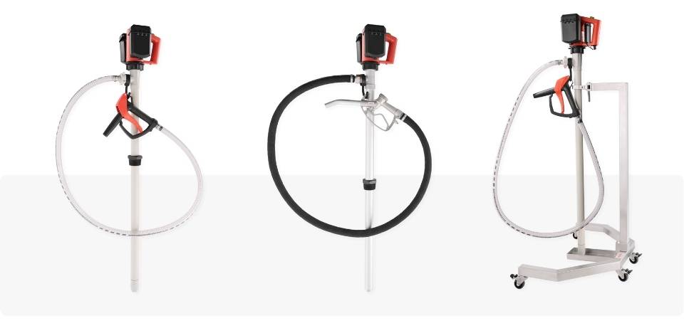 Pumpensets kombinieren Motor, Pumpe, Schlauch und Zapfpistole. Sie sind in verschiedenen Ausführungen und Werkstoffen erhältlich, optional auch mit Pumpenstativ.