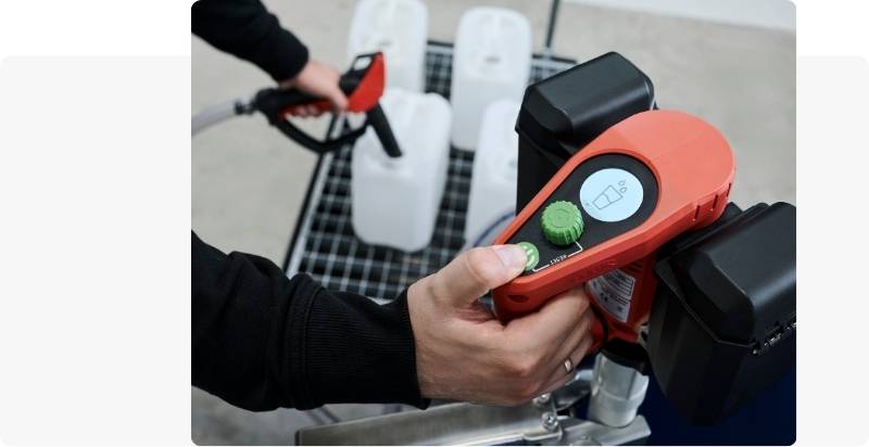 Con una carga de batería se pueden llenar hasta 28 barriles (200 l) de agua con un alto rendimiento de bombeo. Con un rendimiento de bombeo reducido y una velocidad adaptada, a menudo es posible llenar más barriles con una sola carga de batería. La duración real depende del medio bombeado, la altura de bombeo y el nivel de rendimiento ajustado, y en muchas aplicaciones es suficiente para una jornada laboral completa sin necesidad de cambiar la batería.